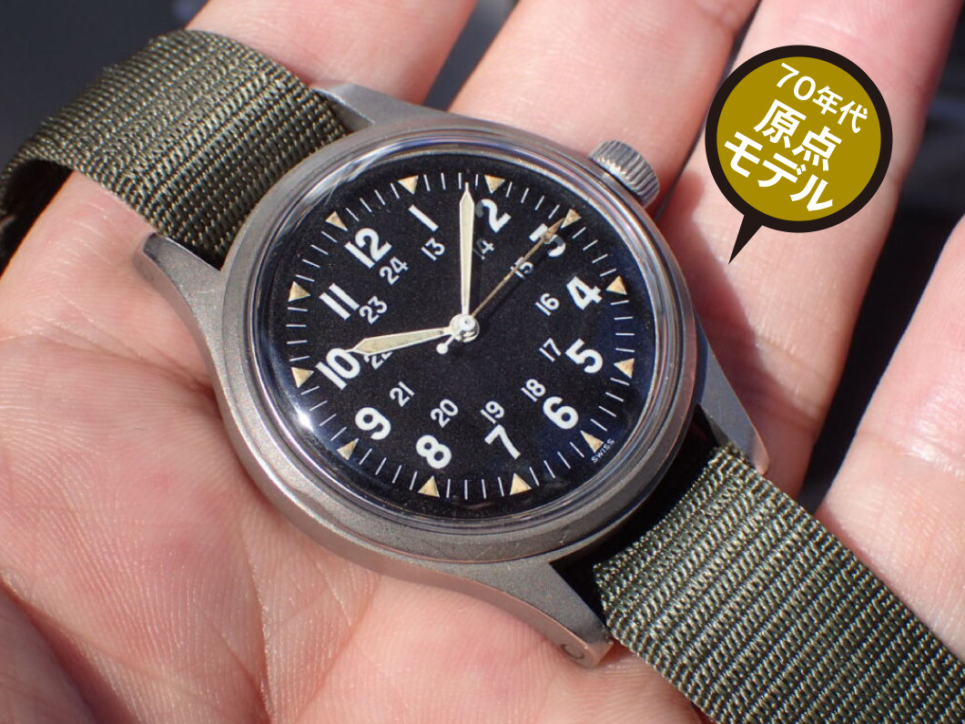 ベトナム戦争以降、米軍で広く採用されたモデル。使い捨てタイプの軍用時計が普及する以前のもので、防塵、防水に優れたつや消しのステンレススチールケースに、ベーシックなセンターセコンド仕様となっている。写真の個体は1970年9月にのみ、アメリカ空軍パイロットに支給された特殊な仕様。復刻モデルはカーキ フィールド メカだ。