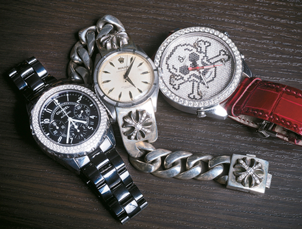 ステージでのド派手な衣裳とは裏腹に、普段は黒一色の上下にクロムハーツというスタイルで通す。「ステージじゃ、こんなにつけなくていいだろ!ってくらい飾りつけた衣裳ばかり着てますからね(笑)。服はシンプルに、その分時計が主役と思っています」
