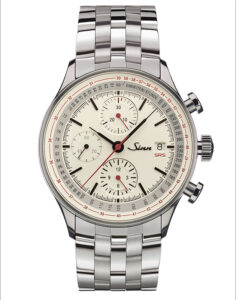 その印象は、アイボリーがかった文字盤からくるところが大きい。黒文字盤がコレクションの大半を占めるジンゆえに、よけいそう感じるのかもしれない。もちろんスペックたるや、ジンらしく決して柔らかではないのだが…(笑)。実はこの文字盤。2016年のジン社創業55年記念モデルとして300本限定リリースされた、スプリットセコンドクロノグラフ(910.JUB)のデザインを受け継いだものなのである。