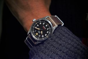 それもそのはず、ケース径39mmと同じパイロット・ウォッチコレクションの既存のマークシリーズに比べて、若干のサイズダウンがなされている。加えてミニッツインデックスの一部と時分針の夜光に、経年変化したようなベージュっぽい色をあえて採用しレトロな雰囲気を演出、オリーブグリーンのNATOタイプの布製ストラップがセットされるなど、かつてイギリス空軍に制式採用された伝説のモデル“マークⅪ”を強くイメージさせるような全体の作りが、このモデルの魅力をグッと引き立てていることは間違いない。