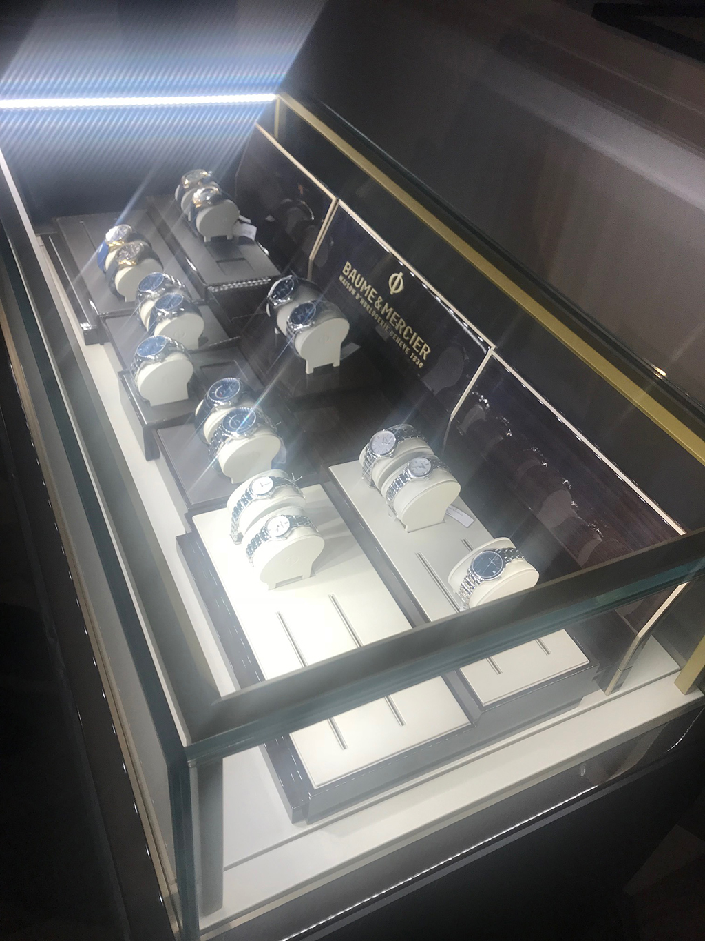 会場には、ボーム&メルシェの歴史的モデルから、現行品まで約20本の時計がショーケースに並べられていた。