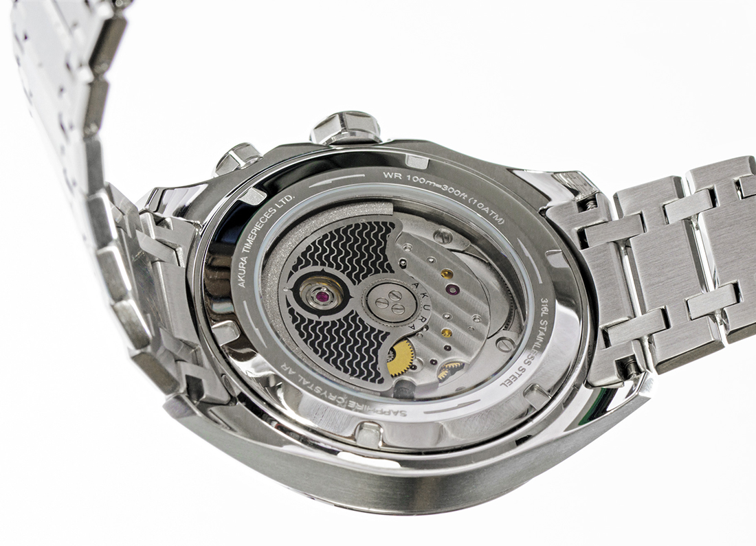 ムーヴメントは、ミヨタ製の自動巻きCal.9015をベースに自動巻きローターをカスタムして搭載。シースルーのスクリューバックだが、普段使いでは非常に心強い100m防水を確保している