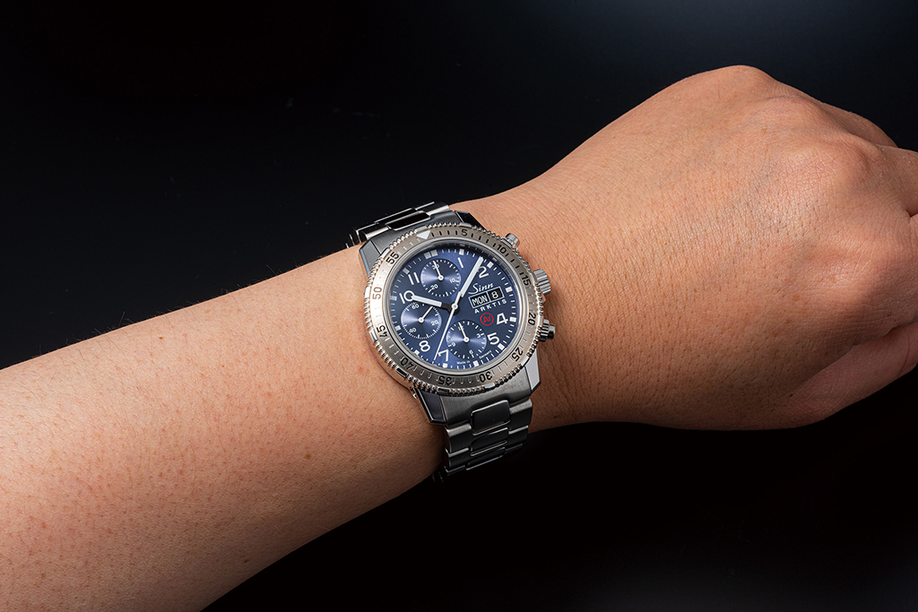 ネジを使用した独自の特殊結合方法で取り付けられた逆回転防止ベゼルは、衝撃でも外れることはない。また特殊オイルの採用で急激な温度変化にも耐えることができ、-45℃〜+80℃の温度範囲でDIN(ドイツ工業規格)が定める刻時精度を維持。その証として自動巻きローターにスノーマークと“-45℃”の文字をあしらう。そして、プッシュボタンをケースに隙間なく取り付けて気密性を高める“D3システム”を新たに採用することでクロノグラフの水中操作が可能に。これはオリジナルの203.アークティスにはなかった機能だ