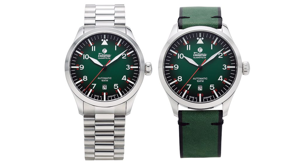 トレンドも意識したカラーがチョイスされグリーン、ブルー、グレー、レッドの4色で展開されるフリーガー スカイ。文字盤の色は中央から外側にかけて黒く落としているため、派手すぎず着けやすいことに加えて、実際のサイズ(41mm径)より引き締まって見える