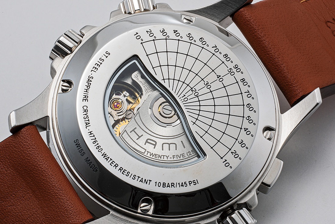 同じスウォッチグループ内というメリットを生かし、ハミルトンは2011年にETA社と共同で専用クロノグラフムーヴメントを開発、発表した。写真はETA社のロングセラークロノグラフムーヴメントであるCal.7750をベースに改良した、ハミルトンのCal.H-21。パワーリザーブを約60時間に延ばした高性能なクロノグラフムーヴメントで、これがいまも10万円台の価格で購入できるというのは、正直驚きである。