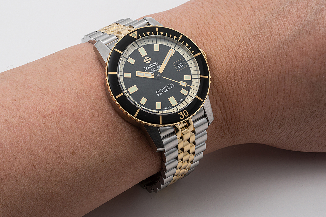 復刻版スーパーシーウルフ 53は40mm。現代の本格ダイバーズとしてはやや小振りだが、レトロな印象でゴールドカラーが高級感を加える。バックルは独自のエクステンション構造を備えており、ぴったりフィットする