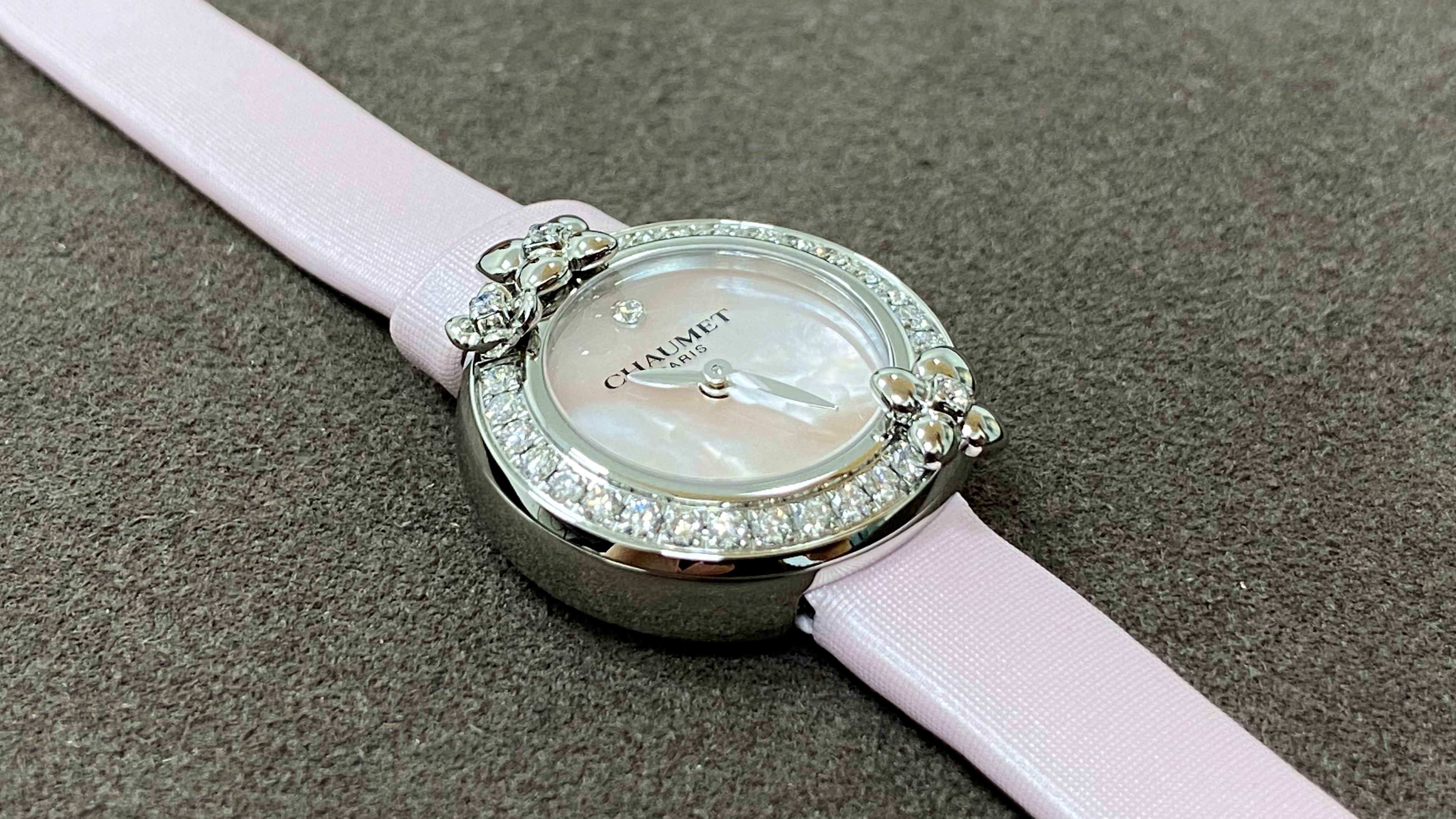 腕を動かすたびに、ダイヤモンドがセッティングされたベゼルと、サクラカラーのMOP文字盤が表情を変えるのが可愛らしかった。