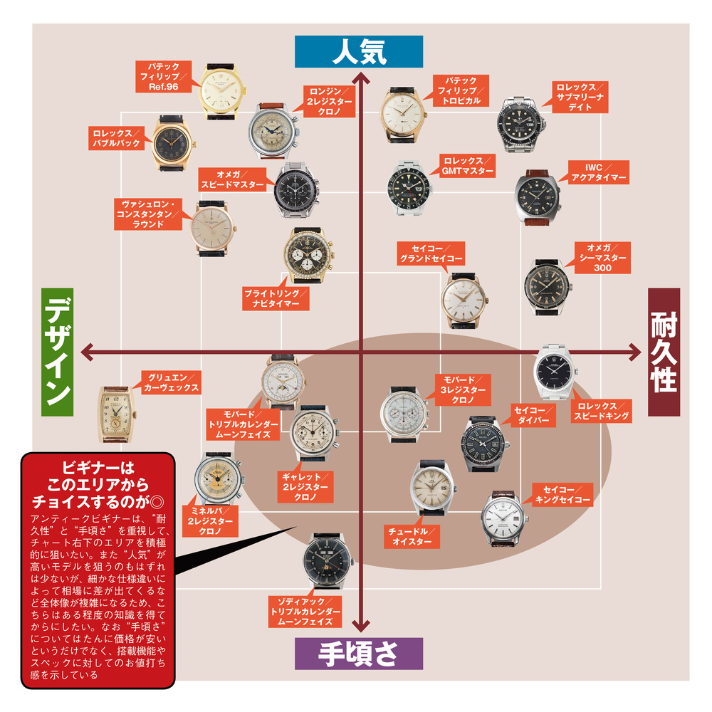また、ここでは“耐久性”“デザイン” “人気”“手頃さ”の四つの要素をもとにアンティークウオッチの代表モデルを編集部が独自にマッピング。各モデルの位置づけを確認すると同時に、自身が重視するポイントを明確にしておくと、選択する際にスムーズだ。