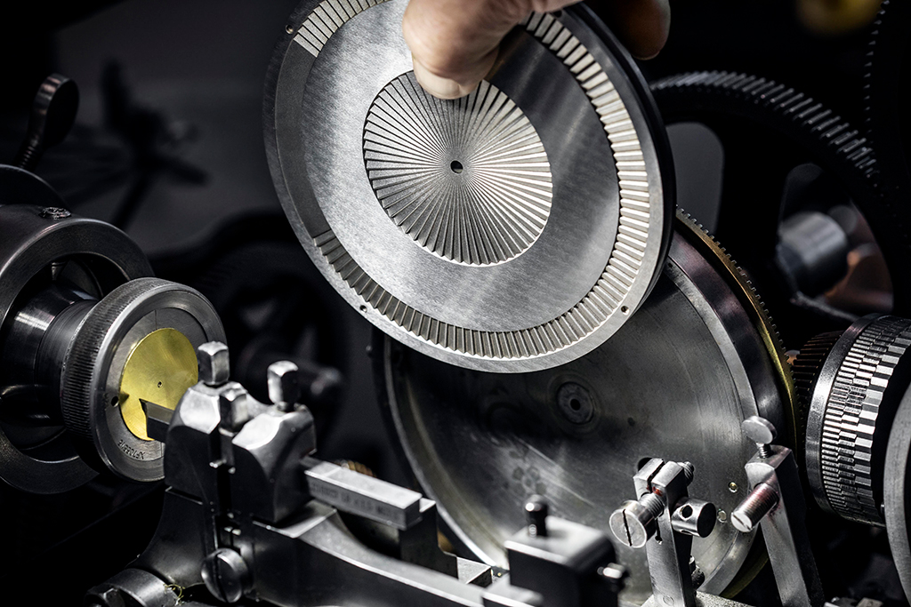 このタペストリー技法とは、旋盤を用いて文字盤に模様を施すという、ギョーシェ彫りと同様の方法を採る加工技術。ヴァシュロンでは1920年代から使用されてきた機械を駆使し、ひとつずつ職人が手間をかけて仕上げている。