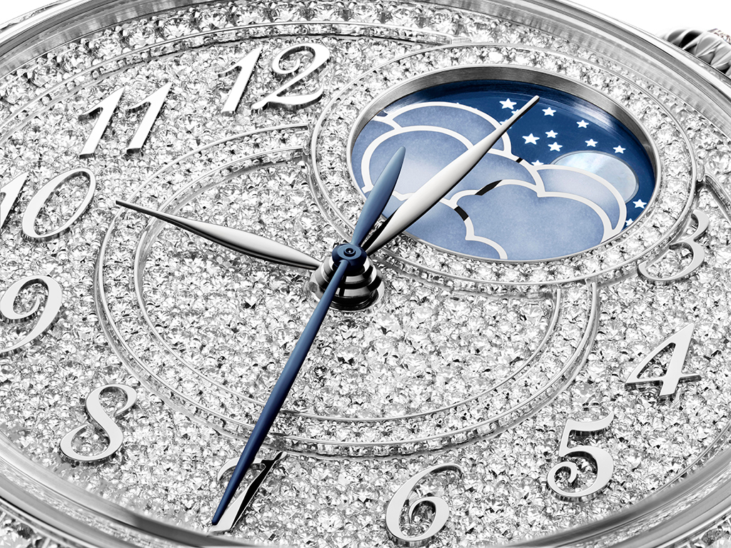 自動巻きモデルで1時と2時位置の間に配置されたムーンフェイズも、本作の見どころ。ムーンフェイズとは月の満ち欠けを文字盤で表示する、女性にも人気の高い古典的な機構である。