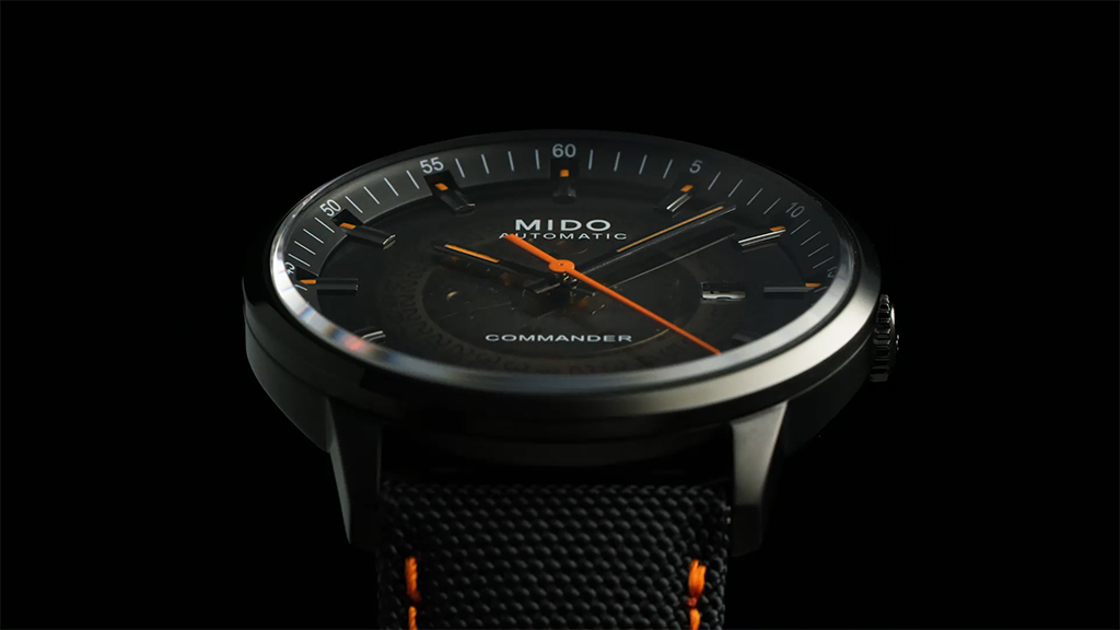 ポリッシュ仕上げのインデックスとダイヤモンドカットの時針と分針にはミドーのブランドカラーであるオレンジのスーパールミノバがあしらわれ、暗所での視認性も確保。同様にオレンジカラーの秒針が、スモーキーな文字盤にアクセントを加えている。また風防にはファセット仕上げのドーム状サファイヤクリスタルを採用し、視認性を高めているのも特徴だ。