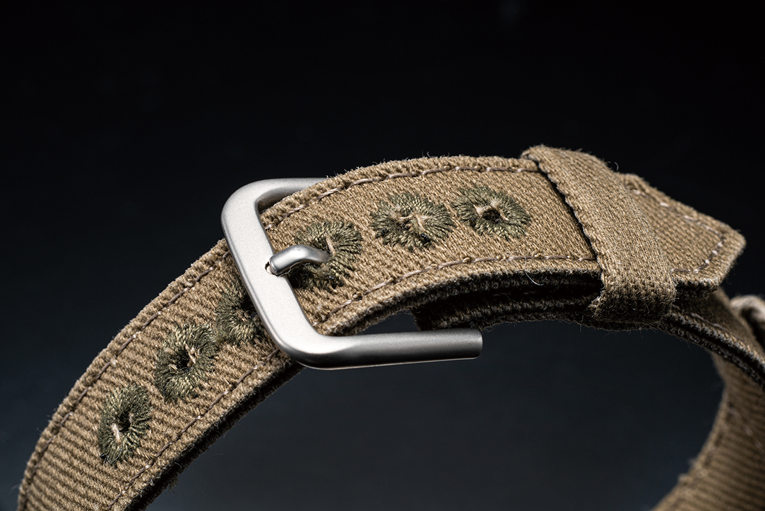 オリジナルを忠実復刻したコットンチノクロスベルトと機能性重視のナイロンベルトがあるが、注目すべきはやはり前者。当時のものを参考にベルト穴を忠実に縫製した