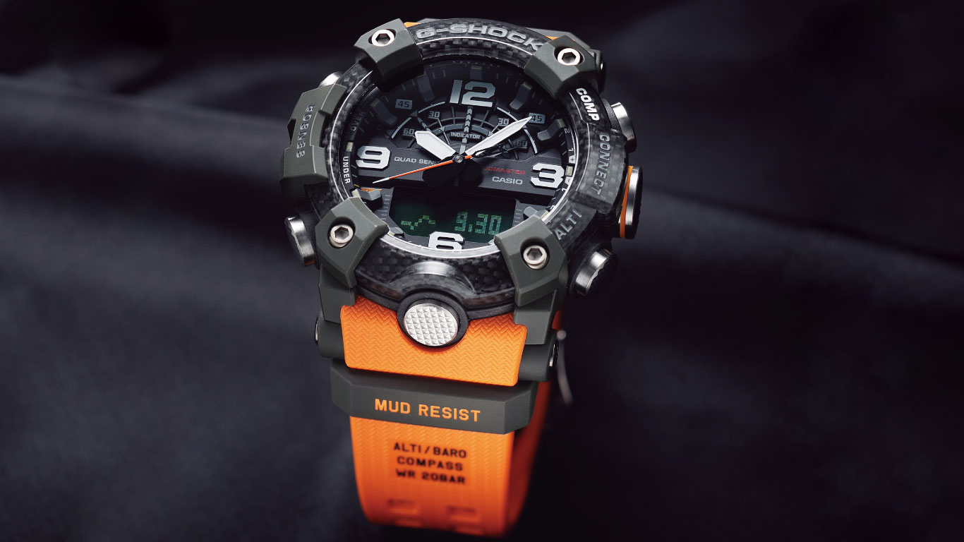 耐久力の高いカーボン素材をまとった新構造のマッドマスター。衝撃などによる破損、変形を抑制し、金属製のボタンパイプなしで高い気密性を確保している。それに加え、ステンレススチールのパネルバック、ガラス繊維入りファインレジンのバックカバーを装備しているため、まさに最強のタフネスウオッチといえる。
