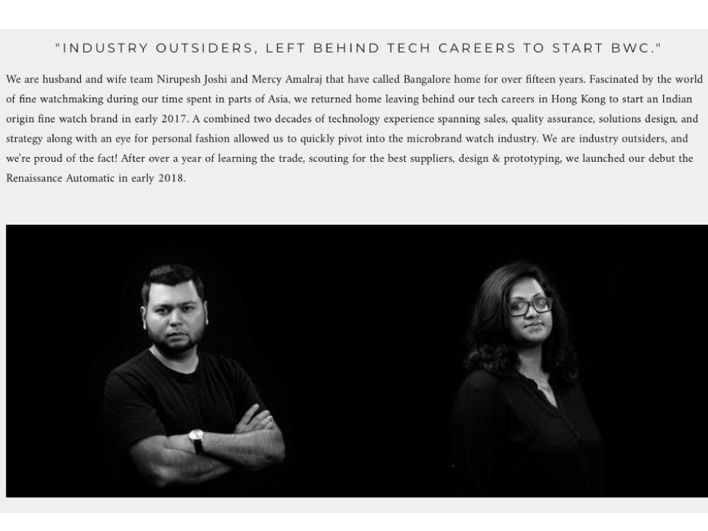 バンガロール・ウオッチ・カンパニーは、Nirupesh JoshiとMercy Amalrajの夫婦によりインド南部の都市、バンガロールで創業した新興時計ブランドだ。 アジア各国でIT関連産業に従事し、赴任した香港で高級時計の世界に魅了された2人は自らの貯蓄を投資し、2017年にバンガロール・ウオッチ・カンパニーを立ち上げた。当然ながら、 時計業界は未経験であったが、IT業界で培った経験とネットワークを活かし、マイクロブランドとして参入を果たしたというわけだ。