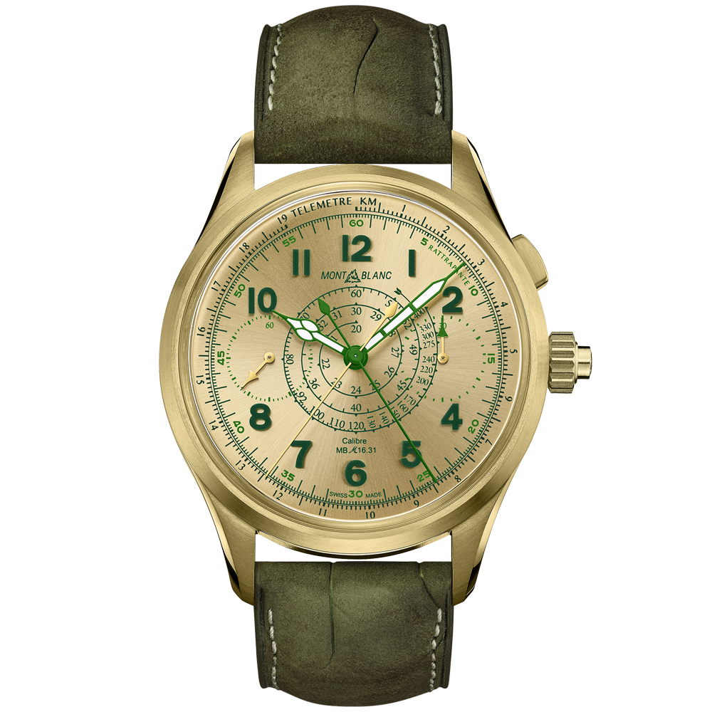 また優れた読みやすさとヴィンテージスタイルを提供するべく、ゴールドを基調に、12時位置にある歴史的なモンブランシンボルマークとともに、コブラ形の時針、スネイルスケール、中央のスプリットセコンド針、タキメーターとテレメーターのスケールなどを、対照的な緑色で組み合わせている。