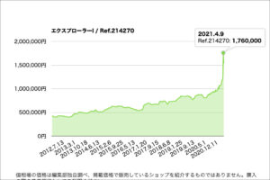 2021年新作としてコンビモデルが発表されて大いに注目を浴びたエクスプローラー I は、モデルチェンジの候補には挙がっていたものの有力視はされていなかったぶん、その驚きもあって高騰。2週間で67万円も値上がりし、何とエクスプローラー II を超えてしまった。しかし、現在は一転して、わずか1週間で23万円も値を下げている。