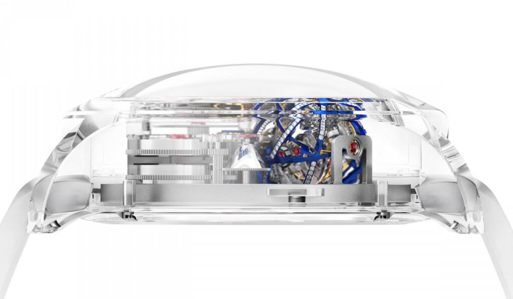 今年発表されたエスケープⅡのニューバージョンは内部の複雑なムーヴメントが全方向から鑑賞できるフルサファイア仕様だ。しかもケースのみならず、文字盤やブリッジ、一部の歯車もサファイアで成形し、“純粋な透明性”を追求したというユニークピースで、スフェリオンの機能美と造形美がより強調されている。サイドから見ると、まるでスフィリオンがまるで中空に浮いているかのようだ。