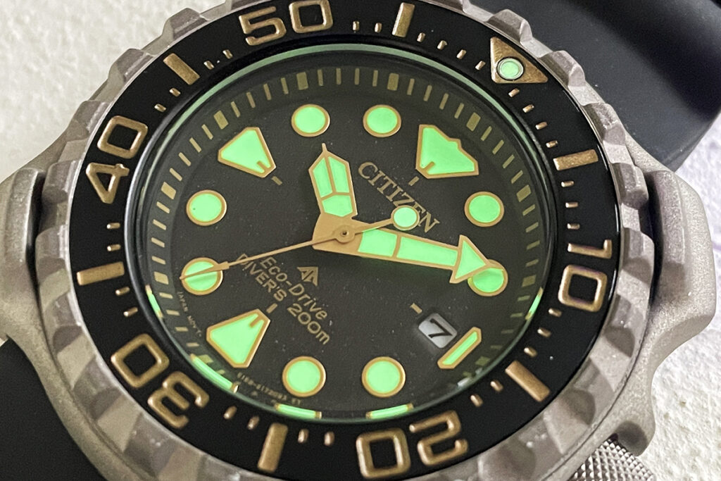 ケースサイズは45.8mmもあるが、ベゼルやガードが占める面積が大きいので、文字盤自体は意外にこじんまりしている。針やインデックスはシンプルだが太めなデザインを採用しているので、文字盤が小さいとはいえ視認性は悪くない。個人的に文字盤はもう1~2mm大きくても良かったように感じるが、全体のバランスは悪くない。オリジナルのプロフェッショナルダイバーはリューズを通常とは逆の9時位置に配していたが、今回のプロマスターではオーソドックスな3時位置になっている。デイリーユースではこちらの方が使いやすいだろう。