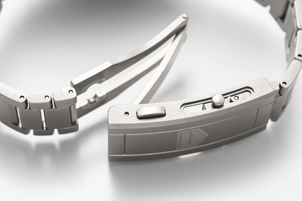 2021年のアップデートによってコレクションは再編され、ケースサイズは43mmと36mmの2種展開に。36mmの小振りなモデルもかなりユニークだが、今回のメインは43mmのモデルのほうだろう。このモデルにはそれぞれブルー、シルバー、ブラック文字盤のステンレススチールモデル3種と、グリーンのベゼルと文字盤を採用したチタンモデル1種類がラインナップ。9月には新たにラバーストラップの3モデルと限定モデルも発売された。この豊富なバリエーションのなかから今回はチタンモデルをクローズアップしてみよう。