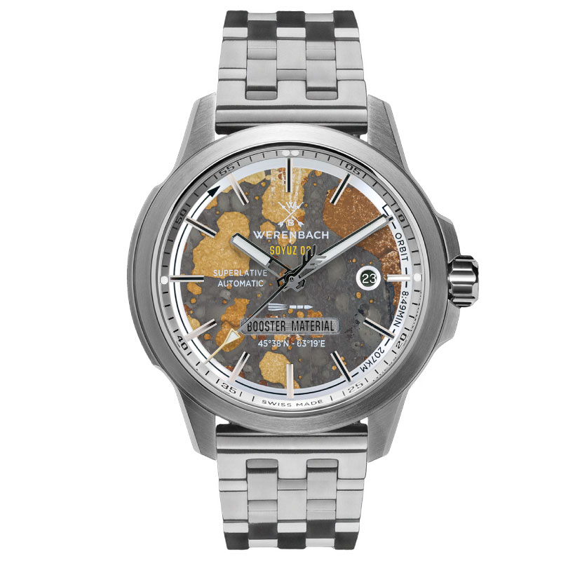 カザフスタンの草原地帯から回収されたロケットを使用して製作された“Werenbach(ヴァーレンバッハ)”の時計。文字盤を見るとロケットエンジン心臓部の燃焼痕がそのまま残っており、ヴァーレンバッハの時計が一点ものであることが保証される。