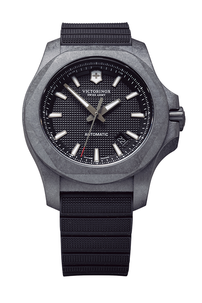 一流のナイフメーカーとして知られるビクトリノックス・スイスアーミーが誇る最強のタフネスモデル。このイノックスは自動巻きモデルでありながら、耐荷重、耐熱、耐振動など130を超える過酷な耐久テストにクリア。ケースにはカーボン複合素材を採用し、優れた耐久性を実現しながらも軽快な着け心地を確保している。カーボン独特の質感も魅力的だ。