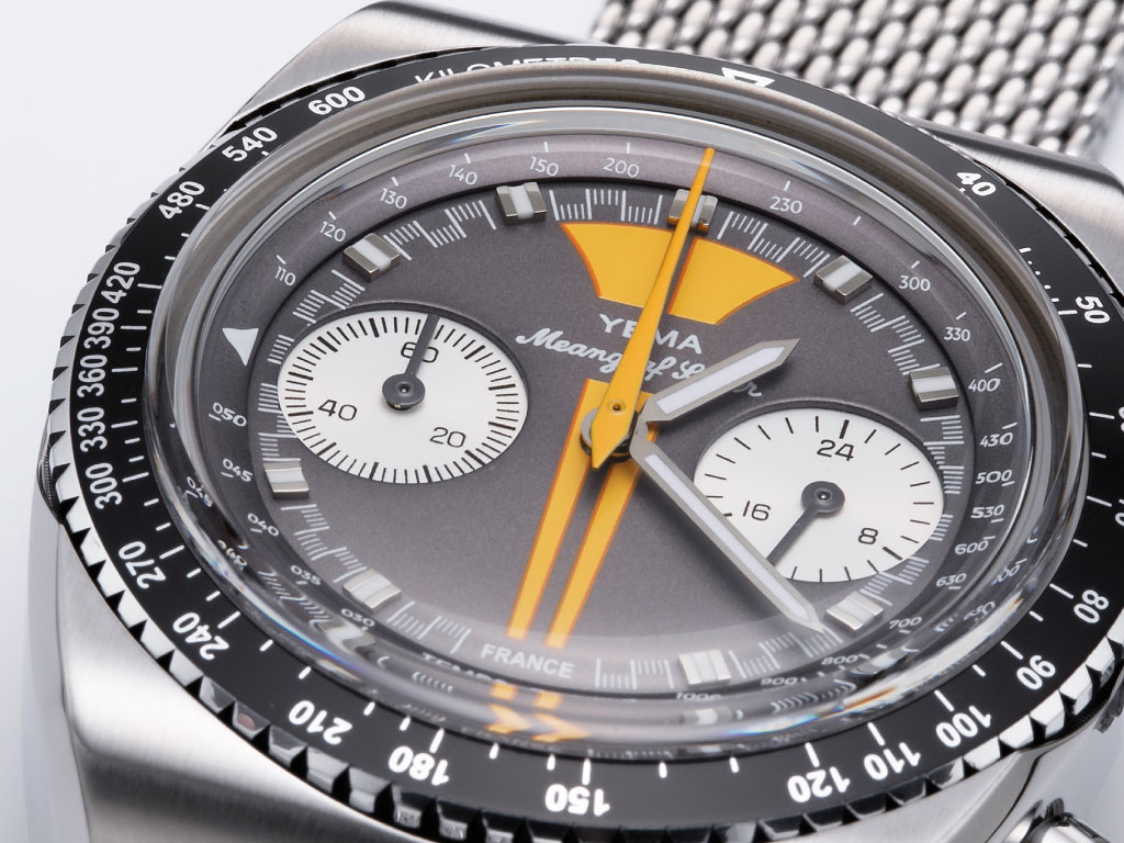 外周には、1960年代後半から70年代の時計に見られた、内側と外側、交互に目盛りを配したデザインをオリジナルから継承。ツーカウンターのインダイアル、ドーム型風防、グラマラスなケースと共に、レトロな雰囲気を際立たせている。