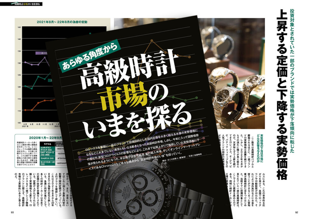 また日本人の平均的手首周りサイズから“腕時計のジャストサイズ”を再考し、小振りな時計の魅力と選び方を解説した「“アンダー39mm”の時計を狙う」特集のほか、高級時計市場のいまを様々な視点から探っていく、ずばり「高級時計市場のいまを探る」と題した特集も見逃せません。現在、ロレックスをはじめとした人気モデルの一部で実勢価格が下落傾向にあります。これは一体なぜなのか。並行輸入ショップや世界的なオンラインマーケットプレイスであるChrono24などへの取材をもとに市場のいまを検証しています。