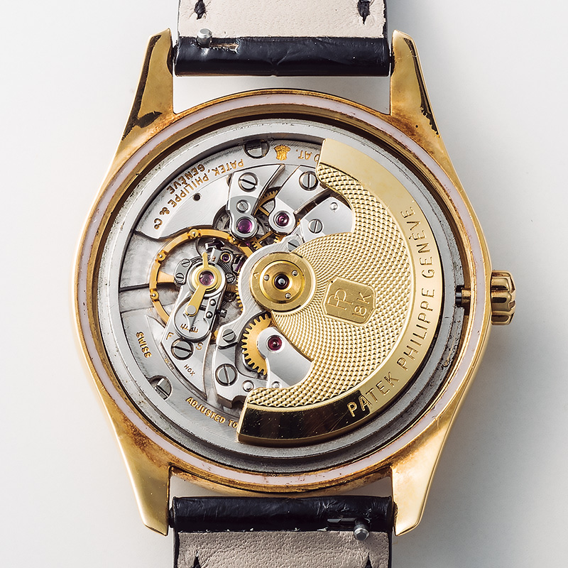 パテック フィリップ初の自動巻きムーヴメントCal.12-600AT。1953年のリリースと、他社に比べると後発だったが、全回転ローター、ラチェット式による自動巻き機構の設計は卓越していた。毎時1万9800振動