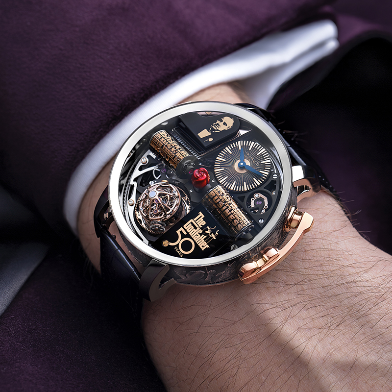 搭載されたムーヴメントは自社製のCal.JCFM04で、634個のパーツから成る3軸のフライングトゥールビヨン。さらにダブルコームオルゴール機構を搭載しており、10時位置のプッシャーを操作すると映画『ゴッドファーザー』のあのテーマ曲を奏でるという非常に凝った仕掛けになっている。このコラボは、同社の創業者であるジェイコブ・アラボ氏自身がこの映画の熱烈なファンであることから実現したようだが、映画の世界観を小さなタイムピースにうまく凝縮している。