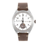 文字盤は分針を省き、時針と秒針のみにした2針仕様。6時位置にはオープンハートを設けており、かなりオリジナリティが際立ったデザインになっている。9時位置には、タイムルーラーを彷彿させる遊び心のあるマークが入っている。文字盤にはサンドブラスト加工を施してマットな質感に仕上げ、イタリアンレザーのベルトと組み合わせた。