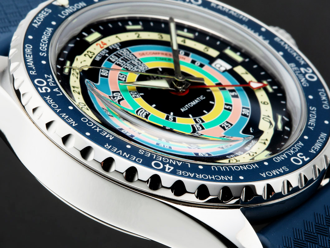 サイズは袖口でもすっきり見せてくれる40.5mm。1960年代のダイバーズによく見られる“トロピック”と呼ばれる型押しのラバーストラップに加えて、ミラネーゼメッシュブレスレットが付属。交換はワンタッチで行えるので、その日の気分や服装によってデザインを使い分けできる。