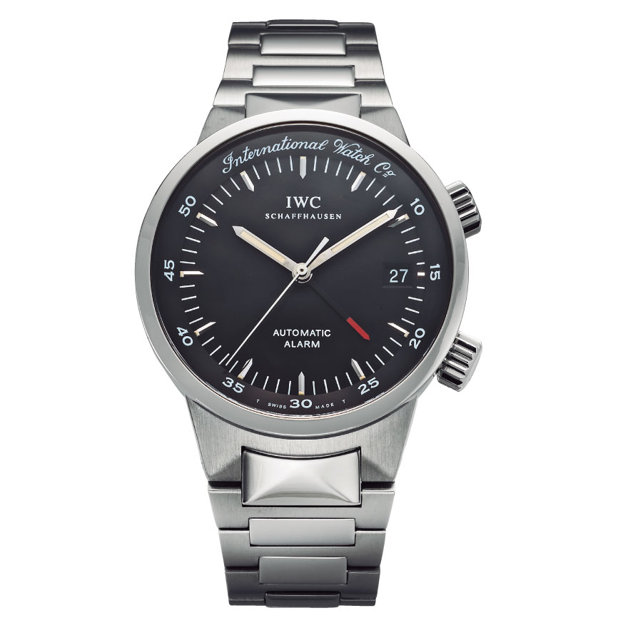 アラームウオッチといえば、世界で初めてアラーム機構搭載の腕時計“クリケット”を製作したヴァルカンと、ジャガー・ルクルトが名手として知られているが、このモデルは、当時IWCと提携関係にあったジャガー・ルクルト製のキャリバー・916をベースにしたキャリバー・917を搭載。