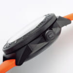 (右)複雑な多面カットの造形を取り入れたケースが存在感を主張。チタンはすり傷や指紋が目立つのが難点なのだが、DLC加工により汚れが目だにくく堅牢な仕様となった。