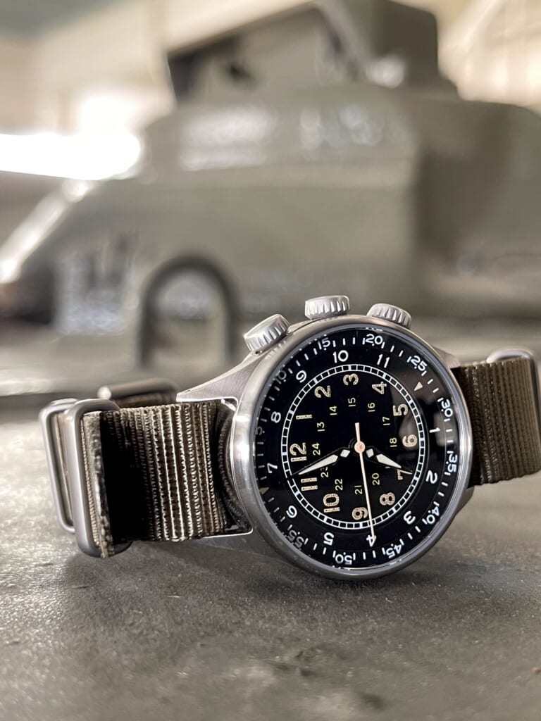 ベルトはオリジナルモデルを再現したオリーブカラーの布製。他にはグリーンのNatoベルトと茶色革もオプションで購入可能。