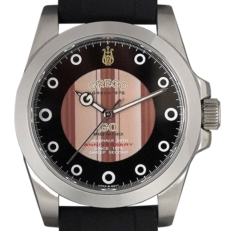 75年に初めて登場したオリジナル・モデルMRをモチーフにした“GWMR-ANV”は、インデックスに“MR-1000V”のポジションマークをデザイン。12時位置のインデックスにはヘッドデザインを描き、その下に“THE GRECO”の文字を施した。