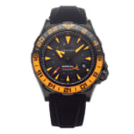 バリエーションとして、ブラックIP加工のステンレススチールにシリコンラバーストラップを組みわせたモデルもラインナップ。ケースとラバーストラップをブラックで統一したことで、オレンジ、グリーンのカラーリングが際立って見える。