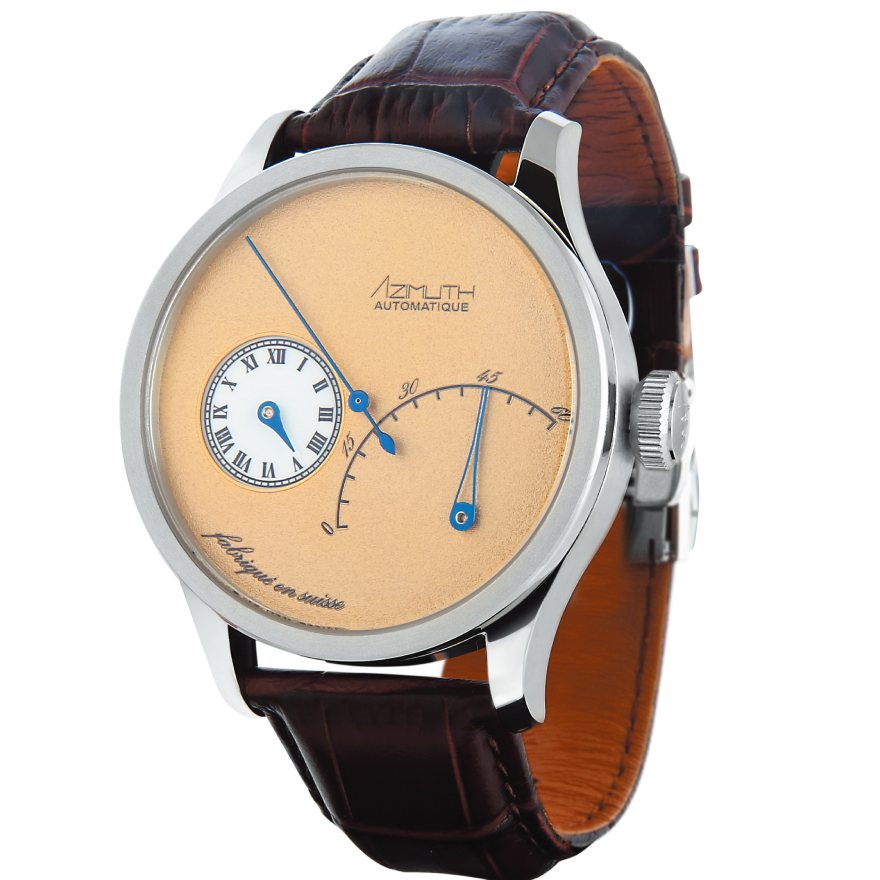 ユニークな発想が際立つ個性派ブランド、アジムースのレトログラード表示モデル。