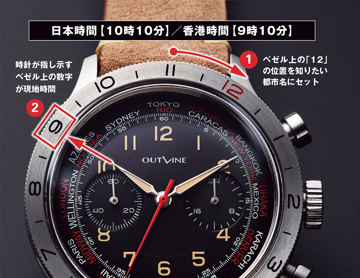 操作方法はいたって簡単だ。回転ベゼル上にある“赤い12”の位置を時刻が知りたい都市名に合わせるだけ(上の写真参照)。つまり、時針が指し示す回転ベゼル上の数字が、選択した都市の時刻というわけである。