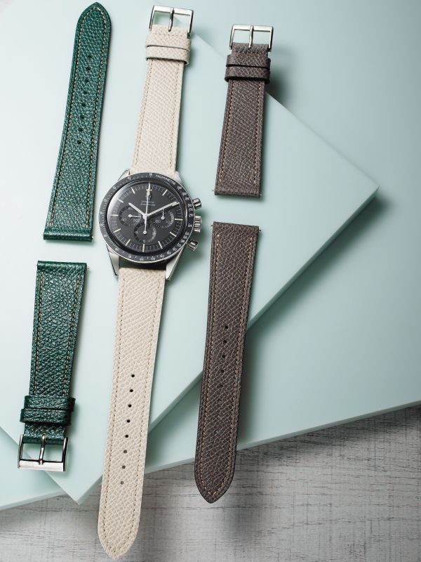 今回は、同ブランドを代表する“STANDARD STRAP”のなかから、人気のグレインカーフモデルをセレクト。通常のレザーにシボ加工を施して薄型に仕上げられており、先端に向かって徐々に幅が絞られるテーパー状のスタイリッシュな形状をもつノスタイムの代表コレクションだ。