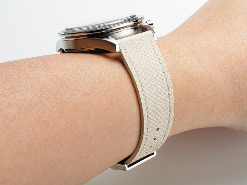 今回は、同ブランドを代表する“STANDARD STRAP”のなかから、人気のグレインカーフモデルをセレクト。通常のレザーにシボ加工を施して薄型に仕上げられており、先端に向かって徐々に幅が絞られるテーパー状のスタイリッシュな形状をもつノスタイムの代表コレクションだ。