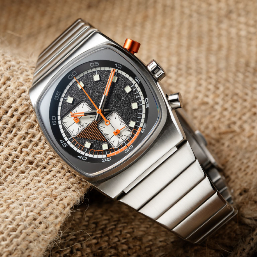 文字盤には1970年代のクロノグラフに見られた、個性的なスクエア型のサブダイアルを採用。さらに夜光インデックスもスクエア形に仕上げられており、レトロかつアイコニックなデザインが目を引きつける。