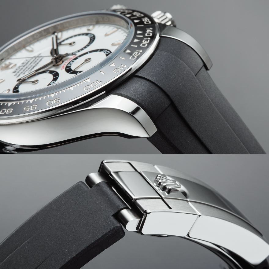 ロレックス純正バックルを使用することで、抜群のフィット感を実現した現行デイトナ専用ラバーベルト(※バックルは付属していない)。現行の定番ステンレススチールモデル(Ref.126500LN)のほか、旧型やゴールド、プラチナモデルなど各型番の専用モデルも展開されている。