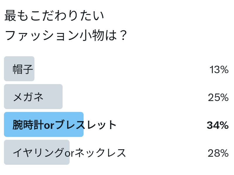 そしてもうひとつ興味深いアンケートデータがある。“最もこだわりたいファッション小物は?”という問いに対して、帽子やメガネ、イヤリング・ネックレスを抑えて“腕時計(ブレスレットも含む)”が最も多くの票を集めたのだ。