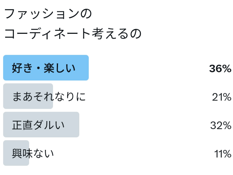 「好き・楽しい」が一番であるという結果から、日々コーディネートを楽しんでいる人がかなり多いことがわかる。一方で、「興味ない」はわずか1割ほどだったのに対して『正直ダルい』がかなり多くの票を集めていることから、興味はあるもののコーディネートに対する難しさ、煩わしさに日々悩んでいる人も決して少なくないことがわかるだろう。