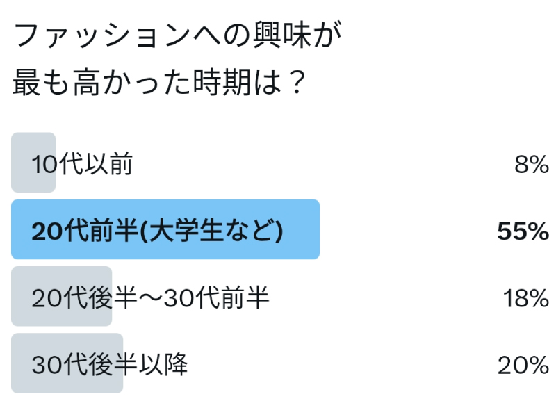 「ファッションへの興味が最も高かった時期は?」のアンケートでは、過半数が『20代前半(大学生など)』を回答。一般的にファッションやコーディネートに対する興味は若い世代のほうが大きいと聞くが、その傾向が正しいと証明するような結果となった。