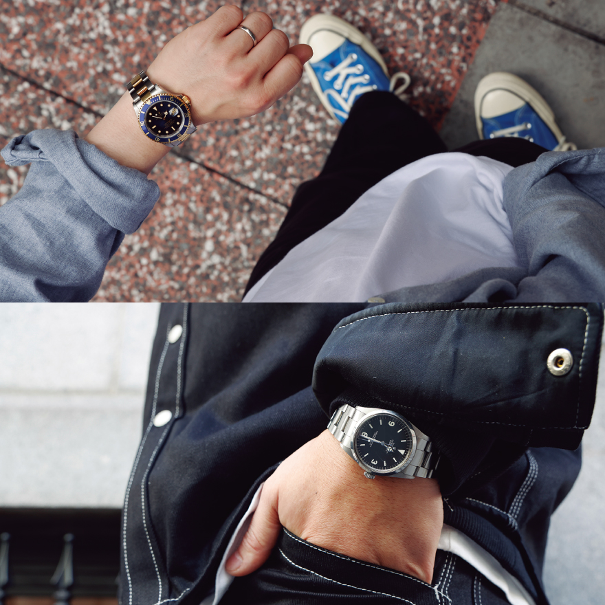 ロレックスのコーディネート例。文字盤やベゼル、ブレスレットの色とファッションの色を揃えることで、コーディネートに統一性をもたせられる