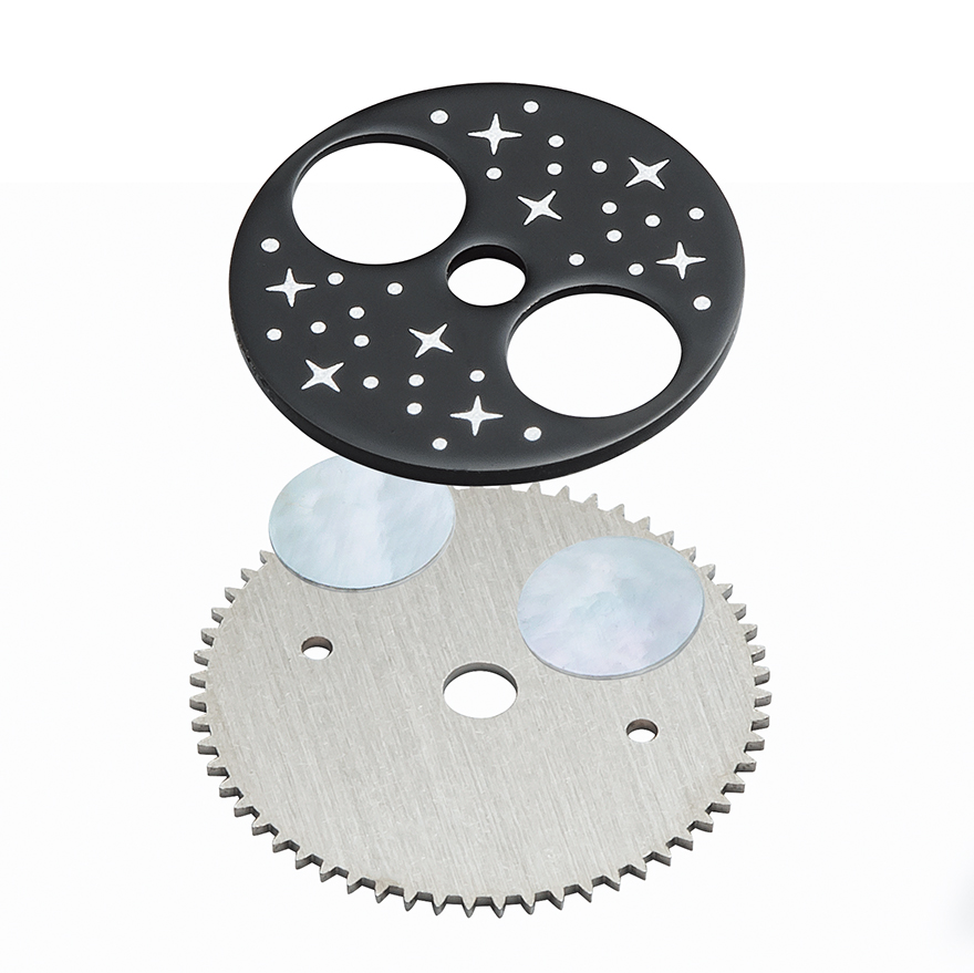 搭載しているCal.F8A62は、手巻き式というだけでなく、既存のF7系とは異なる新構造(特許出願中)の月齢車が採用された新キャリバーだ。月齢表示は、星々が描かれた金属板(写真上)、月をイメージした白蝶貝(同中)、そして月齢車(同下)と、異なる素材によって構成された3層構造で、これにより質感が大きく向上している。加えて手巻きムーヴメントの利点のひとつは、厚みを抑えられること。本作でも、その利点を生かし、ミドルケースと、文字盤の見返しの高さを抑えることで、総厚を11.9mmに留めており、薄型化を実現している。