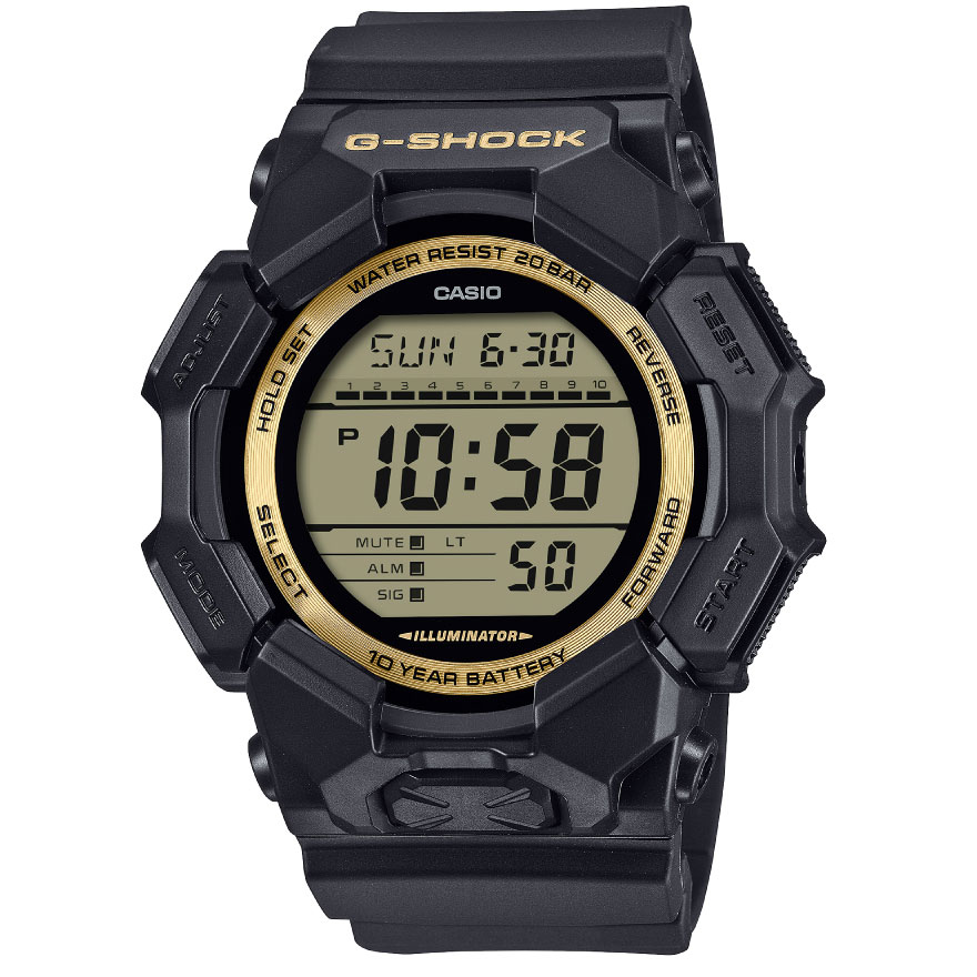 本モデル“GD-010GB-1A9JF”では文字盤にゴールド蒸着を施し、見やすい大型液晶のビッグフェイスデザインを一層際立たせている。