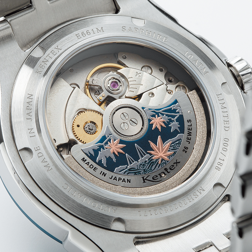 マルチファンクション仕様Cal.9100のローターには、メイド・イン・ジャパンを象徴する“和”の美しさが独自に表現されている。Ⅱでは桜富士モチーフだったが、今作では紅葉をモチーフとしたデザインがあしらわれた