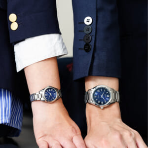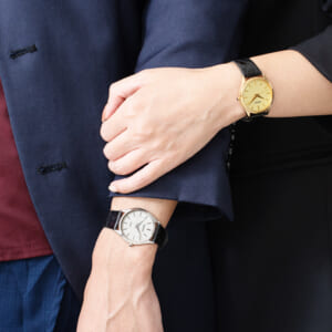 手首が大きい男性が40mm前後、小さい女性が20mm台の時計をサイズ違いで着用する従来の王道ペアウオッチ。ひと目でペアウオッチとわかる明快さと、同じデザインのモデルを選ぶことでパートナーとの繋がりをしっかりと感じられるのが魅力だ。